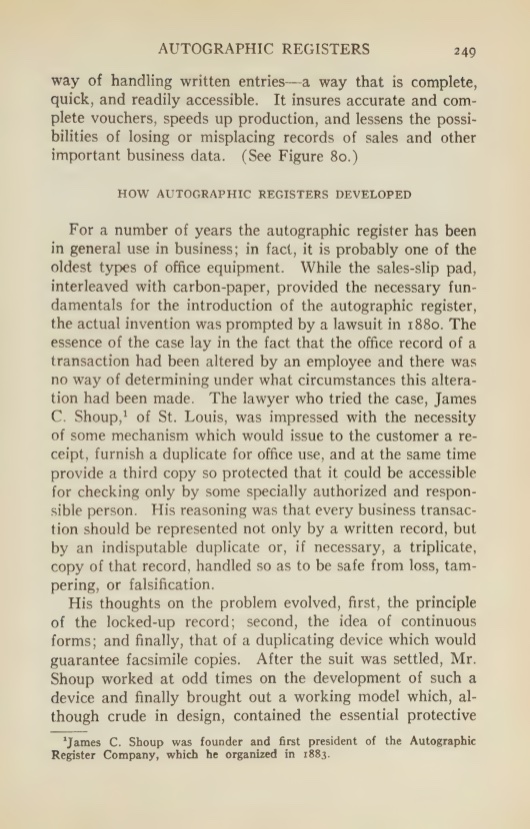 The manual even has an entire chapter (14 if you’re curious) devoted to the autographic register, and gives a much more thorough and well-written account of the pivotal piece of office equipment and its early history. Speaking of which, the story of how Shoup initially thought-up the idea to invent such a machine is quite interesting. I’ll share that page from the manual below…