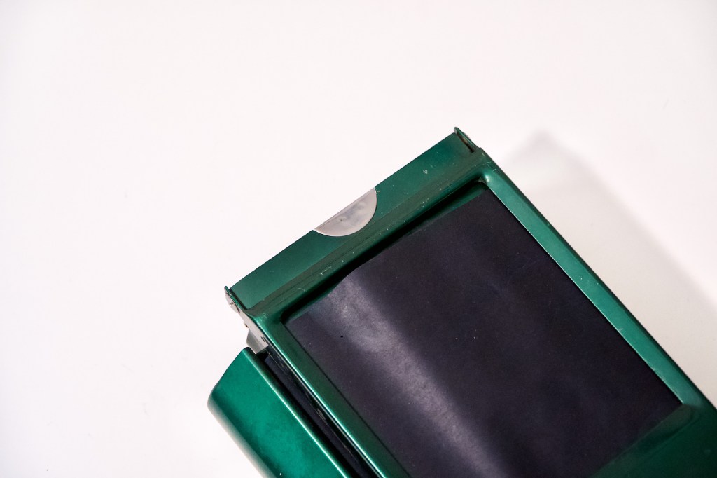 The coating of metallic, emerald-green paint (which reminds me of the color of classic cars from a bygone era) is only scuffed and scratched in a few spots here and there-and still shines in the light. The label at the top-also in surprisingly good condition given the age of the item-bares the model’s fitting slogan: