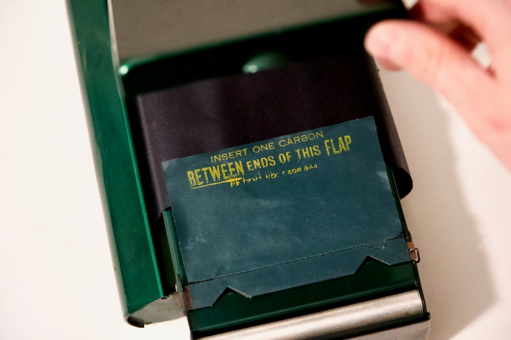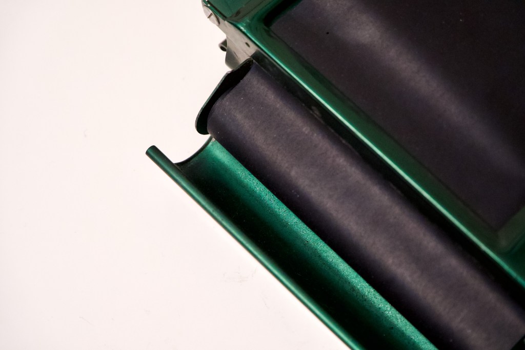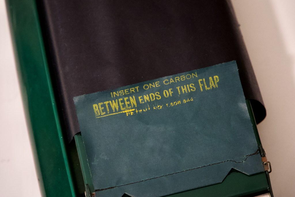 The secret to the machine’s copying abilities (yes it still works) lie in the spool of carbon paper which is cleverly secured behind a cylindrical, armor-like door that is mounted on the side. This paper (see image below) came with the machine, which was a huge bonus. Usually antique-finds like this don’t come preloaded with the paper, or ink, batteries, wiring etc. that you’d need to get the item functioning and working again. So thanks to the previous owner (more on that later) for the carbon paper!