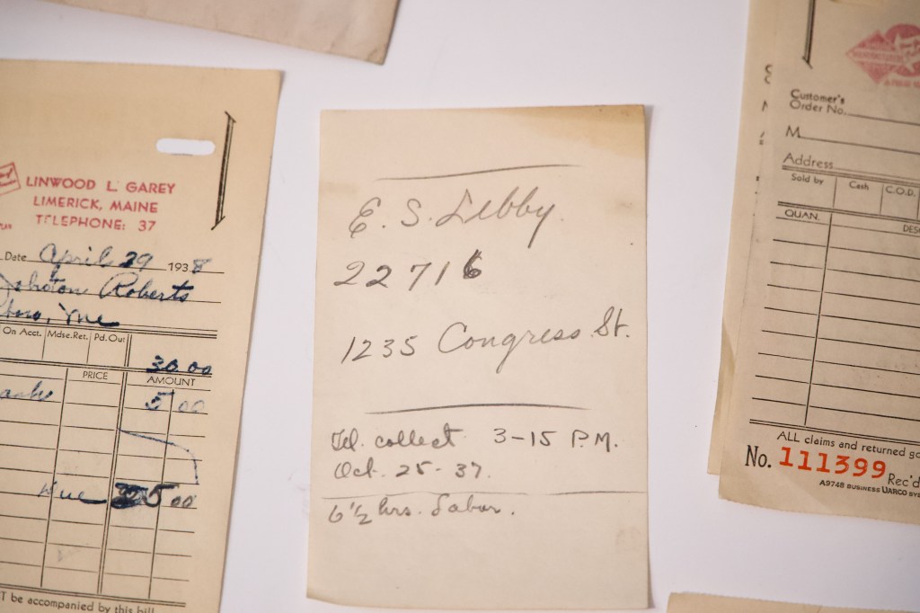The receipts/invoices (pictured below) detail various transactions with people across southern Maine. They also note a variety of small sales-transactions and range from 1937 to 1938. Most are written in blue ink, but a handful are also done in pencil. Most of them are stamped at the top with the same name and information: