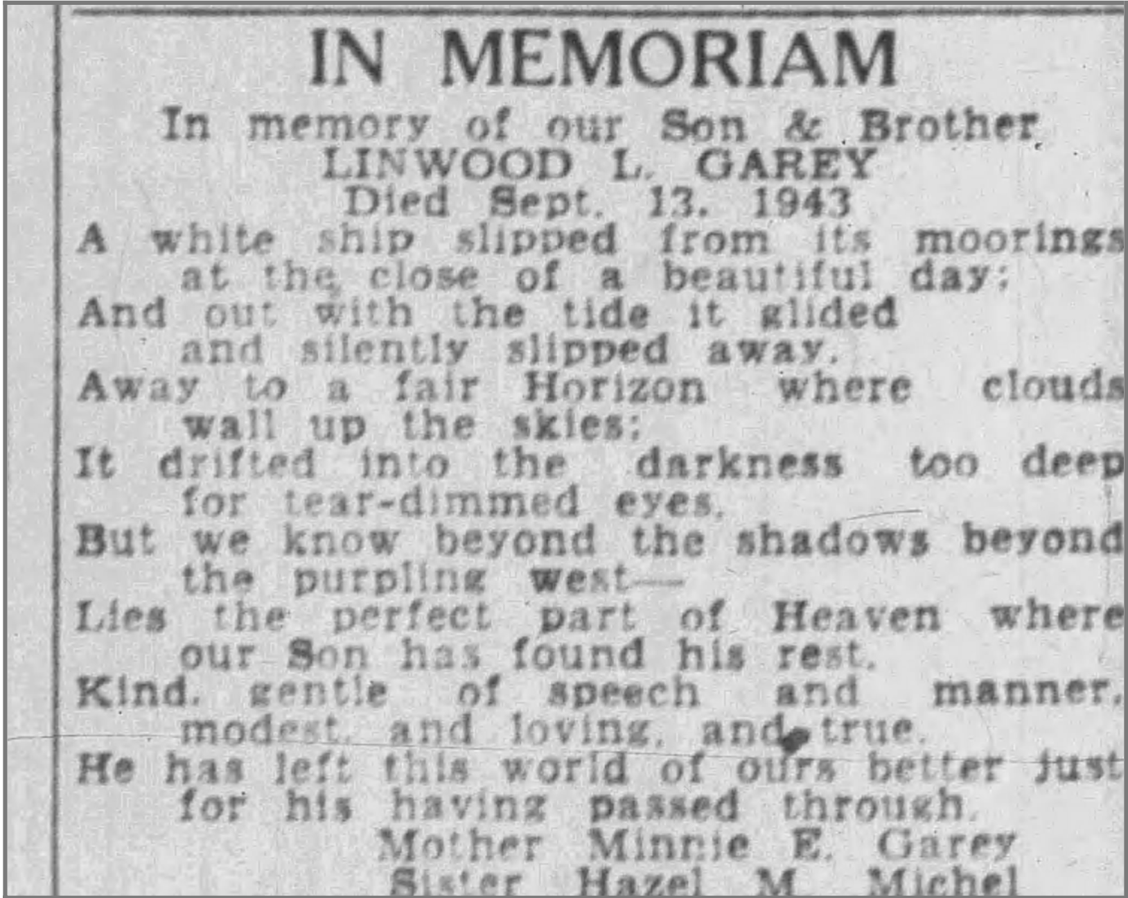 Garey passed away at just 40 years old on September 13th, 1943, leaving behind a wife and daughter. Below I will include some of the newspaper clippings I found which mention him: