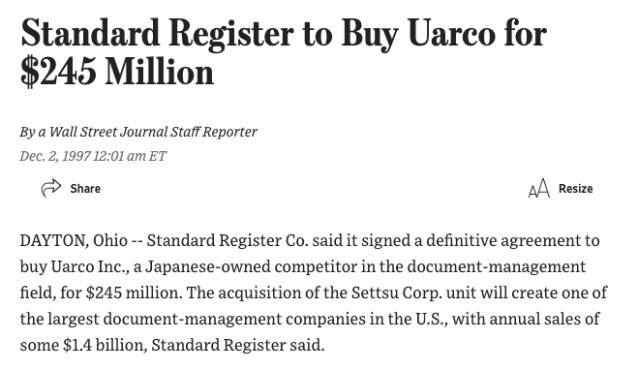 Eventually however, longtime competitor Standard Register Co. acquired the business forms and printing business in 1997 for $245 million.
